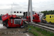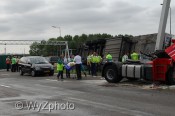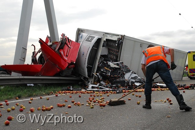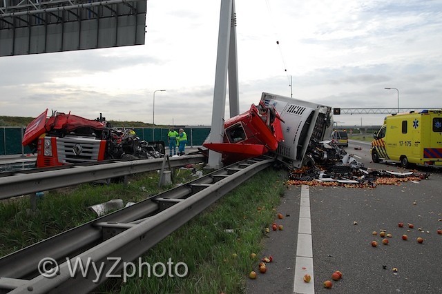 Vanmiddag is op de snelweg A15 ter hoogte van de afslag Zuidplein een vrachtwagenchauffeur om het leven gekomen. Hij reed met zijn vrachtwagen richting Gorinchem en is om nog onduidelijke reden over de middenvangrail geklapt. De aanhanger geladen met appels is hierbij losgebroken van de truck en tegen een portaal tot stilstand gekomen. De cabine van de truck lag verdeeld over twee rijrichtingen.
